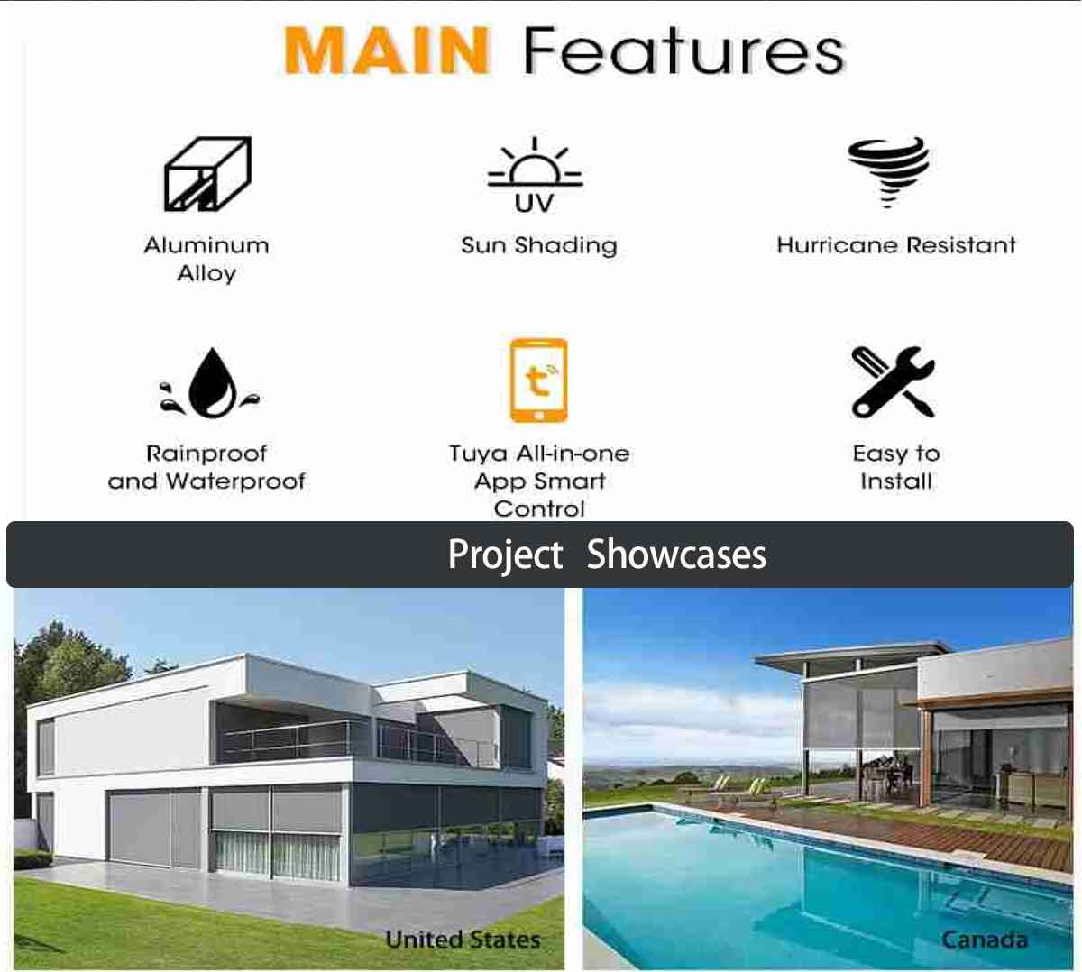 | Accessories | Aluminum Alloy tube, clutch, top cover, bottom rail, side track, zip tracksystem |