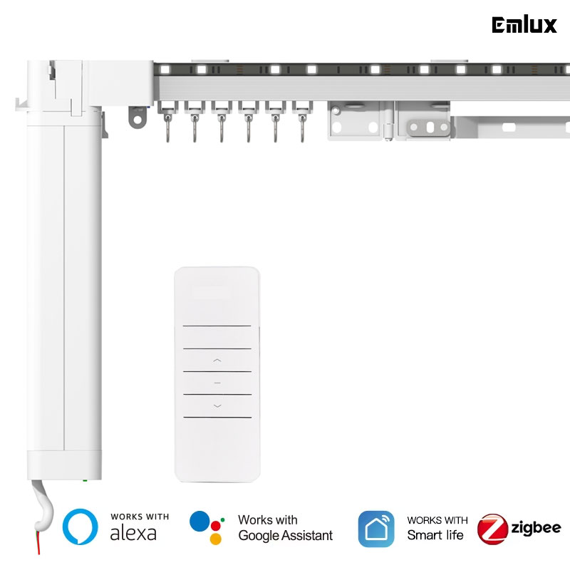 Emlux Motorized curtains with lights track system is made of high-quality aluminum alloy, ensuring durability and a modern design. It supports voice control and is compatible with Amazon, Google, Conrad, and IFTTT, offering seamless smart home integration. With a quiet operation under 35dB and a moving speed of 12cm/s, it provides smooth and silent curtain movement.